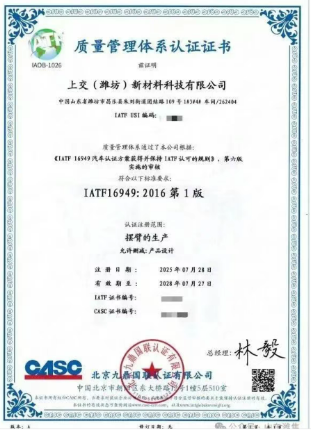 近日,上交(濰坊)新材料公司順利通過北京九鼎國聯(lián)認(rèn)證公司的嚴(yán)格審核,成功取得IATF16949質(zhì)量管理體系認(rèn)證證書,標(biāo)志著公司在汽車行業(yè)質(zhì)量管理領(lǐng)域邁入標(biāo)準(zhǔn)化、規(guī)范化階段。今年以來,公司統(tǒng)籌策劃、主動作為,通過實(shí)施精細(xì)化管理,嚴(yán)格執(zhí)行體系標(biāo)準(zhǔn),規(guī)范生產(chǎn)作業(yè),保障產(chǎn)品質(zhì)量的穩(wěn)定可靠,并成功獲得體系認(rèn)證證書。下一步,公司將以IATF16949質(zhì)量管理體系為基石,持續(xù)深化體系運(yùn)行,強(qiáng)化全員質(zhì)量意識和過程管控,為企業(yè)的可持續(xù)健康發(fā)展注入強(qiáng)勁動能。